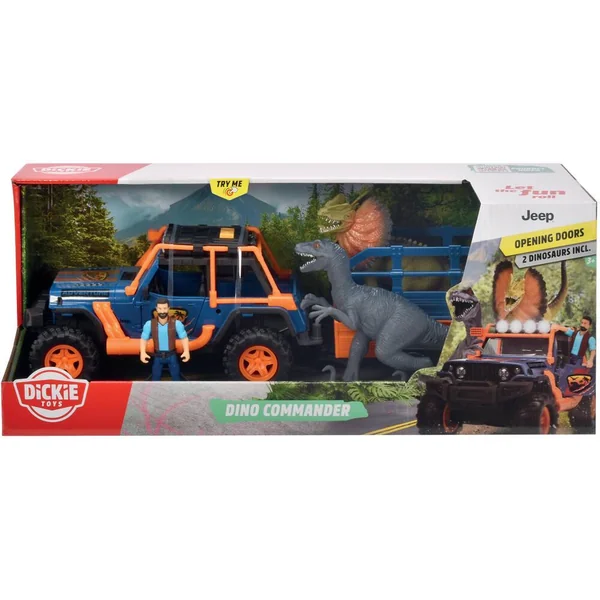 Coffret commandant de dinosaures : 1 véhicule Jeep Wrangler + remorque à roues libres et pneus caoutchouc avec son et lumière, 1 figurine articulée et 2 dinosaures.