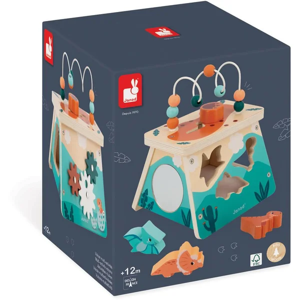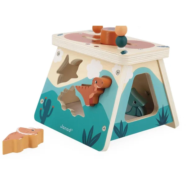Sur la face de devant vous retrouverez une boite à forme avec un tyrannosaure, un tricératops et un ptéranodon à encastrer dans la forme correspondante. Les dinosaures ne font pas de bruit quand ils tombent grâce à la feutrine installée au fond de la boite.