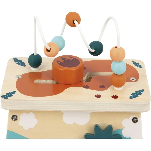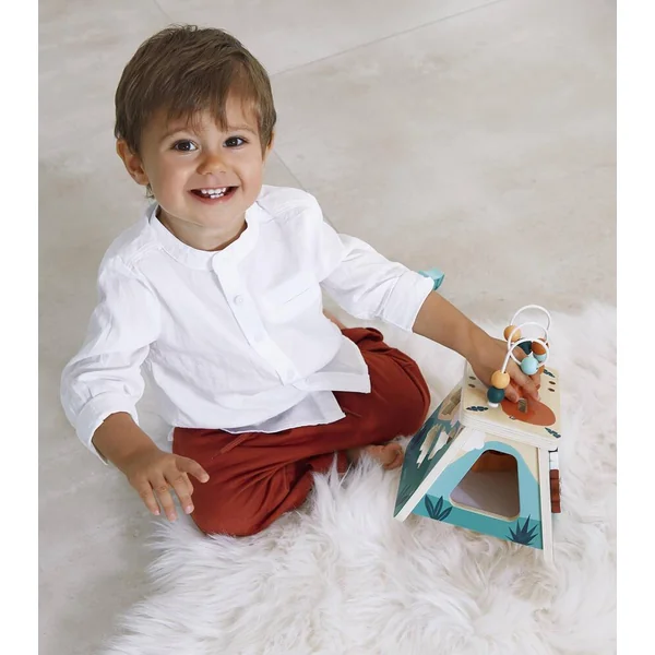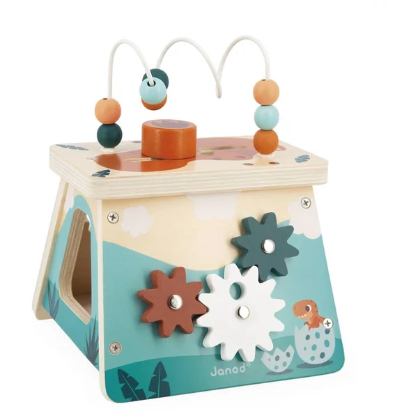 Votre enfant pourra facilement récupérer les pièces grâce à une grande ouverture sur le côté. La face de derrière propose trois engrenages à tourner, sur le côté gauche un miroir et pour finir sur le haut de ce volcan multi-activités se trouvent un labyrinthe et un boulier et ses perles en bois. Ces 5 activités, aideront votre enfant à développer sa motricité fine, sa dextérité et sa curiosité.