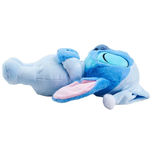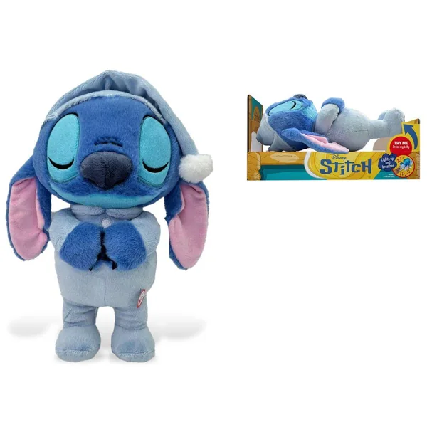 Disney Stitch. Peluche apaisante avec fonction musicale et mouvement de respiration. Dès la naissance. 3 piles LR03 fournies. Fonction Try Me. 100 % polyester. Nettoyage en surface.