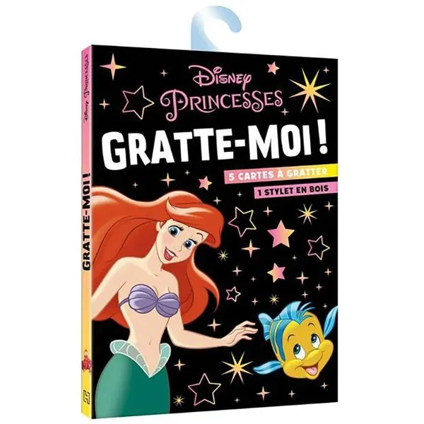 Sur chaque carte, la silhouette d’une Princesse Disney est tracée en couleur, ainsi que des éléments de décor. À l’aide du stylet, l’enfant gratte l’intérieur de la silhouette et les formes tout autour pour révéler le dessin, et découvrir un arc-en-ciel de couleurs !