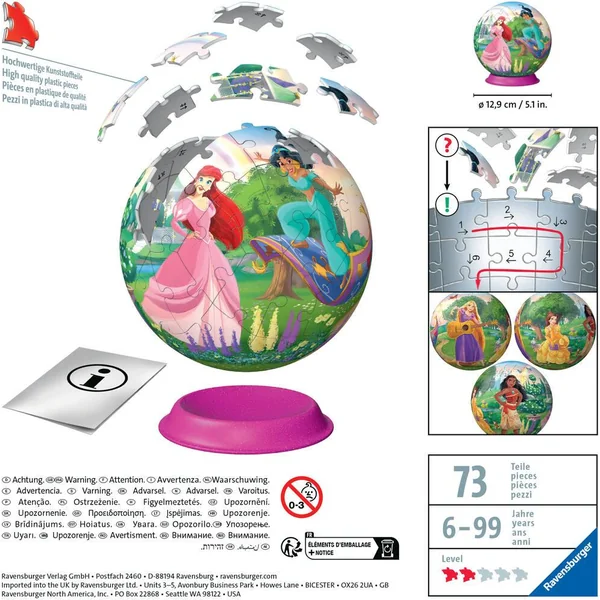 Un puzzle 3D rond Disney Princesses, facile à assembler grâce à ses 72 pièces numérotées. Il suffit de suivre l’ordre des numéros et le sens des flèches indiqués au verso des pièces de puzzle. Toutes les pièces s’emboitent parfaitement grâce à la technologie Easyclick. Une fois monté, le puzzle 3D reste bien stable, il n’a pas besoin d’être collé, et peut être exposé sur son support inclus. Ce puzzle offrira aux filles comme aux garcons dès 6 ans une expérience de puzzle ludique et originale dans l’univers de leurs héros favoris. Assemblez cette superbe reproduction en puzzle 3D du monde fantastique des Disney Princesses ! Fabriqué en Europe, ce puzzle est composé de matériaux issus de forêts bien gérées certifiées FSC, de matériaux recyclés et de matériaux issus d’autres sources contrôlées (FSC-C111262 , FSC : organisme à but non lucratif qui protège, contrôle et encourage la gestion durable des forêts).