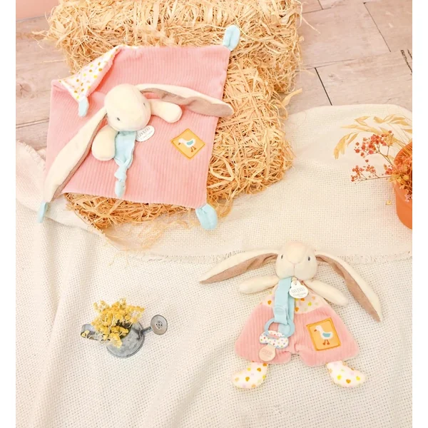 Le lapin est habillé d’une tenue en velours côtelé rose avec un écusson de canard, et la texture douce à l’intérieur de ses longues oreilles invite à être pressée et froissée, ce qui divertit et apaise l’enfant.