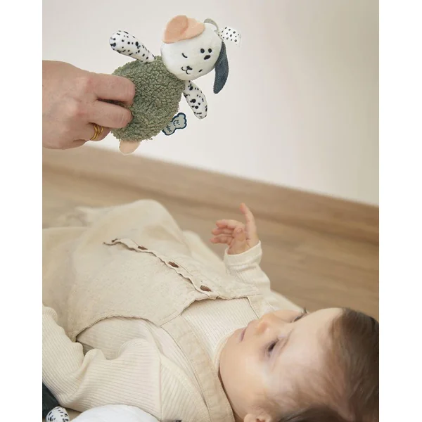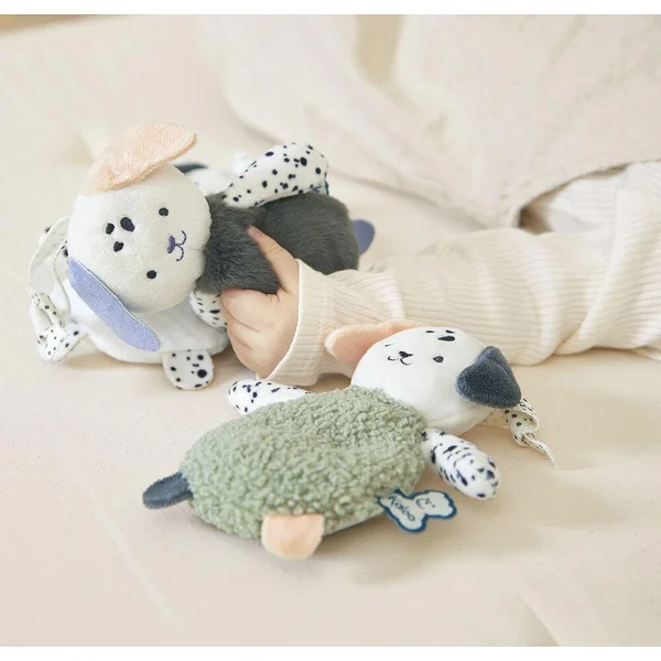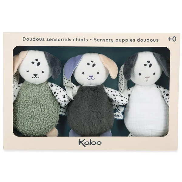Développé en collaboration avec des psychomotriciens, ce set de doudous chiots sensoriels nomade est idéal à transporter et accrocher partout avec ses rubans afin d’éveiller bébé dès la naissance. Ces 3 formes de chiots aux couleurs et textures différentes (1 doudou bruissant, 1 doudou tout doux lesté et 1 doudou léger) permettent de développer les sens de bébé. La préhension fine sera stimulée grâce aux tissus avec différentes textures pour familiariser bébé à des sensations tactiles variées. Les couleurs et imprimés à pois contrastés permettront de développer la vue de bébé. Enfin, laissez bébé découvrir par lui-même les différents touchers en placant les petits chiots près de lui. Il va ainsi développer ses compétences sensori-motrices. Lavage en machine à 30°C. Dès la naissance.