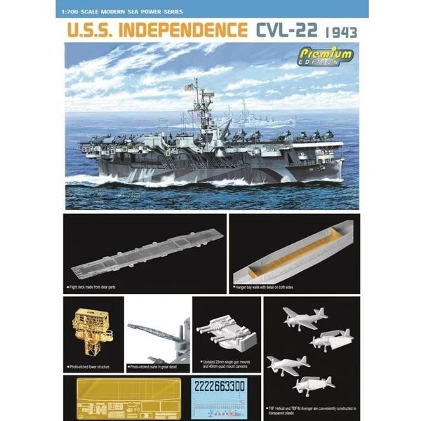 Dragon USS Independence CVL-22 1/700 – 7054Dragon Models Limited : La Référence en Modèles Réduits depuis 1987Dragon Models Limited, établi en 1987, se distingue dans le domaine du modélisme par la fourniture de kits de modélisme alliant qualité supérieure, précision extrême et innovation constante. La marque est devenue une référence pour les modélistes de tous niveaux, séduisant aussi bien les amateurs que les experts à la recherche de modèles réduits d’exception. Une Tradition de Qualité et d’Innovation