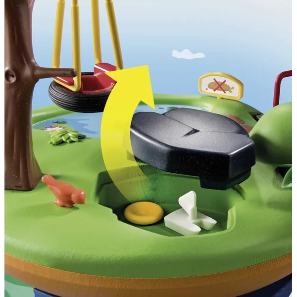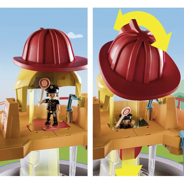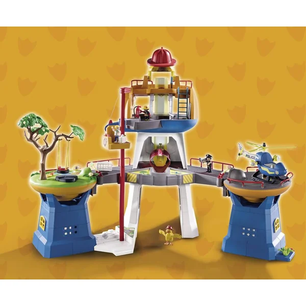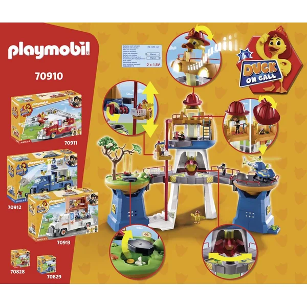 Le quartier général DUCK ON CALL est le centre d’opérations de Duck Ducklas, Freddy, Polly et Mikey. S’il y a une urgence à Playmoville, les quatre héros sont immédiatement sur place ! Dès que l’alarme retentit, Freddy saute rapidement dans le toboggan pour descendre jusqu’en bas. Polly prend l’ascenseur à manivelle et embarque dans son hélicoptère de police, tandis que Mikey les coordonne les ordres de mission dans le centre de commandement secret situé dans la petite tour. Après une mission réussie, le quatuor se détend sur l’aire de jeux avec ses balançoires et un petit bassin. Le set de jeu contient les quatre personnages DUCK ON CALL, Duck Ducklas , Polly, Freddy et Mikey, le quartier général DUCK ON CALL avec un toboggan, un ascenseur, une plate-forme d’atterrissage, un centre de commande secret et un hélicoptère de police.