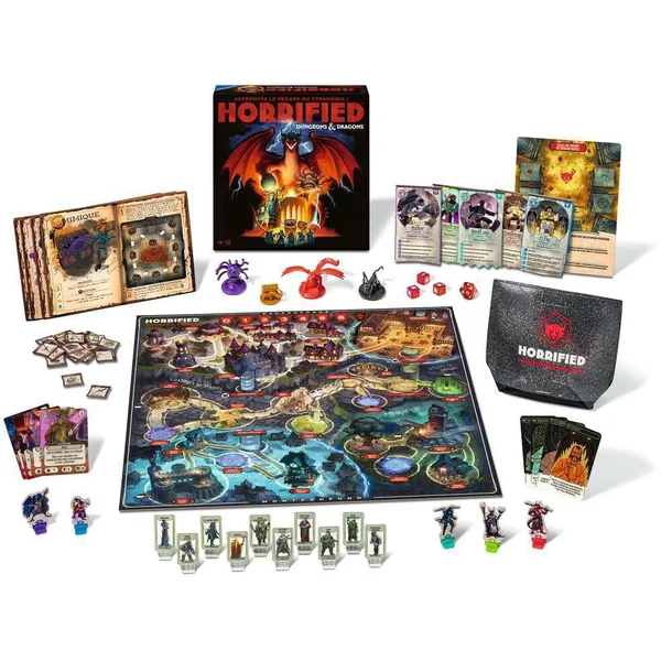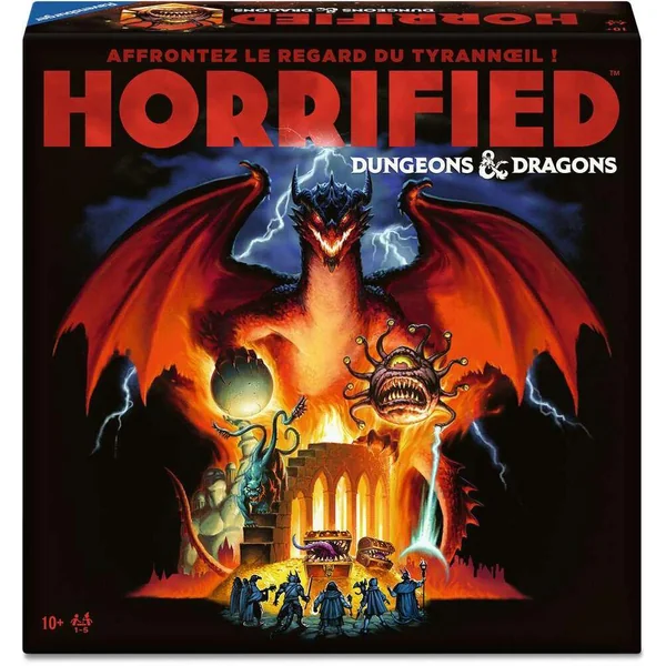 Dans Horrified : Dungeons ET Dragons, vous incarnez des Héros et les citoyens ont fait appel à vous pour vaincre les monstres et protéger la ville d’Eauprofonde. Vous allez devoir coopérer pour neutraliser le Tyrannoeil, la Mimique, la Bête éclipsante ou encore le redoutable Dragon Rouge ! Chaque monstre a ses propres faiblesses et sa propre manière d’être vaincu ! Choisissez les monstres que vous voulez affronter pour ajuster la difficulté du jeu.Parcourez la ville d’Eauprofonde pour récupérer des objets et les utiliser pour vaincre les monstres sans vous faire attraper et tuer, sauvez également le plus de citoyens possible. Obtenez des faveurs et subissez le hasard des dés. Parviendrez-vous à sauver les citoyens et à sauver la ville avant que la terreur ne vous envahisse ? Pour ce faire, coopérez bien et réfléchissez ensemble à la meilleure manière de vaincre ces monstres mythiques ! Horrified : Dungeons ET Dragons est un jeu jouable de 1 à 5 joueurs dès 10 ans pour des parties de 45 à 60 minutes.