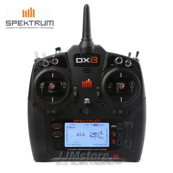 Radicommande DX8 G2 Spektrum sans récepteur Comme son prédécesseur, la nouvelle DX8 redéfinit les standards des émetteurs 8 voies avec des caractéristiques et capacités d’exception qui éclipseront tous les autres modèles de cette classe. Caractéristiques de la nouvelle radiocommande Spektrum DX8 G2 : Antenne multidirectionnelle En utilisant une combinaison de réseaux vertical et horizontal, l’antenne multidirectionnelle offre une superbe protection contre les angles morts de polarisation, vous assurant ainsi un signal permanent pour votre récepteur. Alertes vocales programmables La DX8 vous permet de garder un œil sur les fonctions importantes sans quitter votre modèle des yeux. Vous pouvez programmer des alertes vocales pour vous indiquer le mode de vol choisi ou donner des informations télémétrie sur demande. Si une alarme retentit, vous n’aurez pas besoin de regarder l’écran pour savoir ce qui se passe. La DX8 vous le dira. Ecolage sans fil L’écolage sans fil permet aux instructeurs de se connecter sans fil à un autre émetteur DSM2/DSMX. Une fois que la DX8 est appairée à un autre émetteur, la technologie ModelMatch permet une reconnexion à la DX8 sans devoir refaire le processus d’appairage. Les pilotes de drones équipés d’une caméra peuvent utiliser la liaison écolage sans fil pour assigner les fonctions de la nacelle ou de dérive à l’émetteur. Le pilote pourra ainsi se focaliser sur le pilotage pour éviter les obstacles pendant que l’émetteur s’occupe du cadrage. 250 modèles mémorisables La DX8 possède une capacité de stockage exceptionnelle, vous aurez rarement voir jamais besoin de jongler entre votre émetteur et carte SD. Le menu de mémoire de modèle est encore plus simple à utiliser. Seuls les emplacements avec un réglage modèle sauvegardé apparaitront à l’écran. Plus besoin de naviguer parmi les emplacements vides ou de déplacer des modèles si vous en supprimez un. Etant donné que la DX8 utilise le même logiciel AirWare que de nombreux émetteurs Spektrum, vous pouvez partager les réglages modèle avec d’autres pilotes Spektrum. Télémétrie intégrée La télémétrie intégrée vous donne des informations en temps réel comme le niveau de la batterie de votre modèle, la qualité du signal, la température du moteur, la vitesse, l’altitude et plus encore.* Avec le système d’alerte vocale, vous pouvez régler votre DX8 pour qu’elle vous prévienne quand vous approchez ou dépassez les limites que vous avez réglées. Vous pouvez également assigner un interrupteur pour basculer dans une séquence de valeurs télémétrie que vous aurez préalablement définie. Si vous souhaitez analyser la télémétrie après votre vol, vous pouvez enregistrer les données de votre DX8 sur une carte SD. Fonctions programmables La DX8 vous propose une liste impressionnante de fonctions programmables pouvant rivaliser avec des émetteurs plus chers. Avion