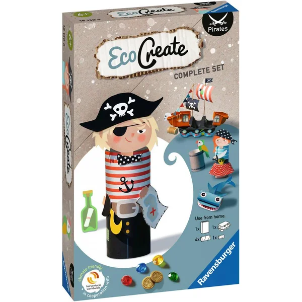 Créative et éducative, la gamme EcoCreate permet aux enfants de fabriquer des objets pour jouer, décorer ou stocker, en réutilisant des emballages tout en apprenant les enjeux du recyclage et de la préservation de l’environnement. Clé en main, les coffrets EcoCreate contiennent tout le nécessaire pour réaliser les projets : des plans de montage, de la peinture et un pinceau, des pièces en bois et en plastique, de la laine, un tube de colle, … Un vrai gain de temps et d’énergie pour les parents ! Parmi 4 thèmes de la collection Mini, l’univers des pirates saura ravir les enfants. A partir d’une boite à œuf ou de rouleaux de papier, les enfants créent écologiquement : 1 bateau, 2 figurines garçon et fille, 1 requin, 1 perroquet et 1 coffre aux trésors. Ce produit est composé de matériaux issus de forêts bien gérées certifiées FSC®, de matériaux recyclés et de matériaux issus d’autres sources contrôlées (FSC-C111262).