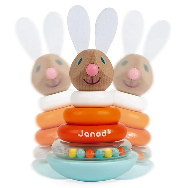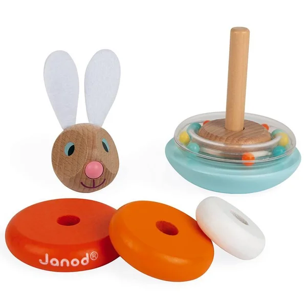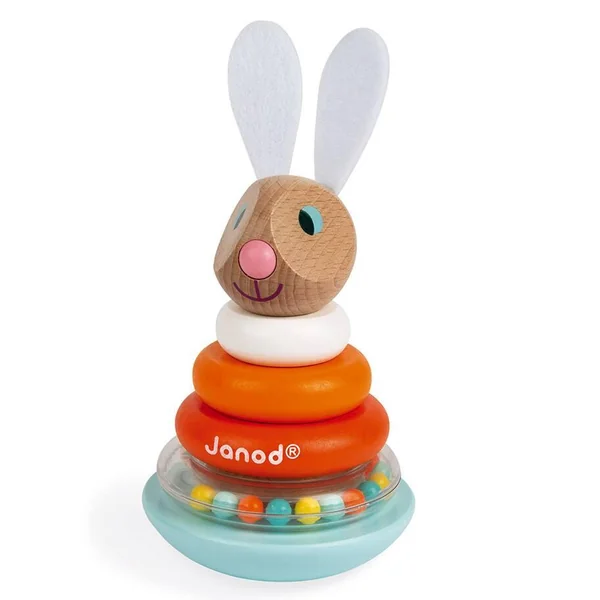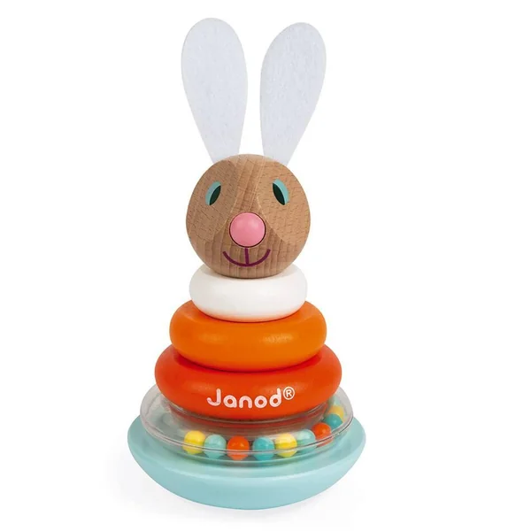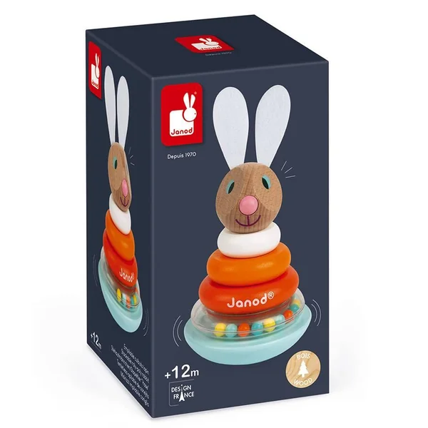 Un lapin à recomposer en empilant les différentes pièces en bois pour obtenir un joli culbuto. Un anneau avec des billes colorées qui tintent joyeusement lorsque le lapin bouge ! Les oreilles du lapin sont en feutrine pour un toucher tout doux ! Bois : hêtre, merisier et pin. Oreilles en feutrine. Anneau et billes en plastique.
