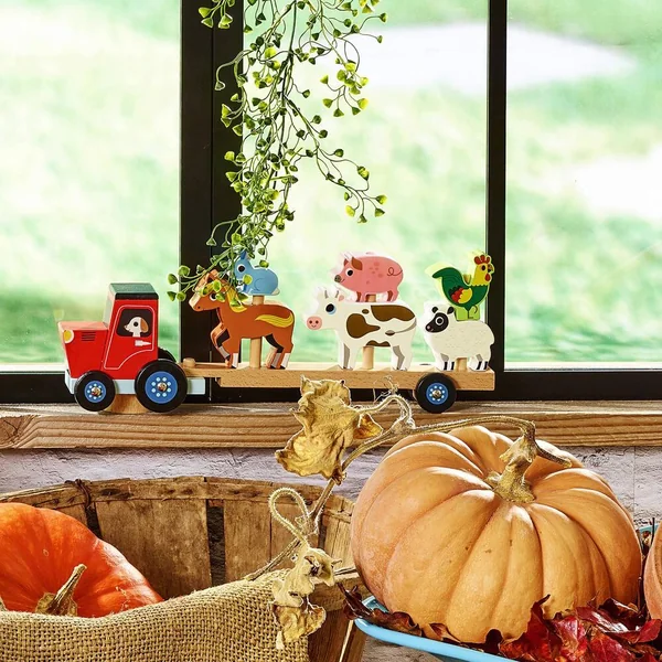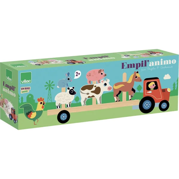 De jolis animaux en bois à empiler sur la remorque du tracteur. Illustré par Ingela P.Arrhenius.