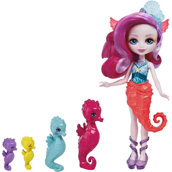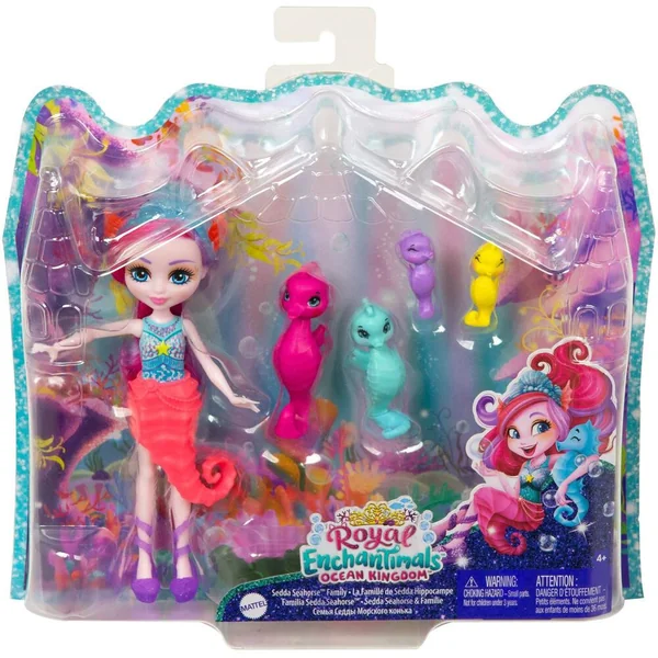Ce coffret Famille Enchantimals de la collection Royaume de l’océan inclut 1 poupée Sedda Hippocampe (15 cm) et ses 4 amis hippocampes. La poupée Sedda Hippocampe arbore un look fabuleux composé d’une jupe en forme de queue d’hippocampe, d’une magnifique couronne et de jolies chaussures. Les figurines hippocampes pailletées sont toutes adorables à leur façon. Les enfants vont adorer recréer le lien si spécial qui unit cette famille Enchantimals. Avec 5 personnages dans un même coffret, il y a encore plus de possibilités de s’amuser ! Les couleurs et les décorations peuvent varier.