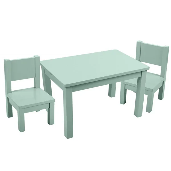 Fabriqué à en bois massif d’hévéa, cet ensemble comprend une table et deux chaises Montessori assorties de couleur vert sauge.