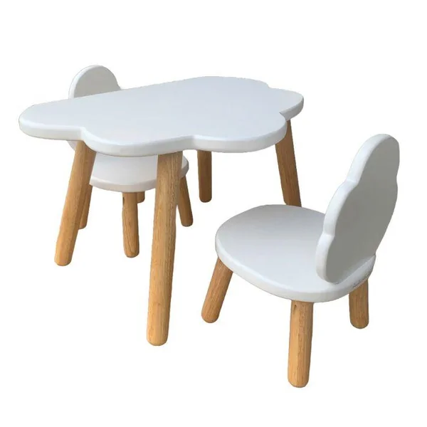 Cet ensemble en bois massif d’hévéa comprend une table et deux chaises Montessori de la toute nouvelle collection Nuage Blanc. Parfaitement adapté à la taille des petits de 1 à 4 ans, il leur permettra d’avoir un espace confortable pour jouer, dessiner ou manger.