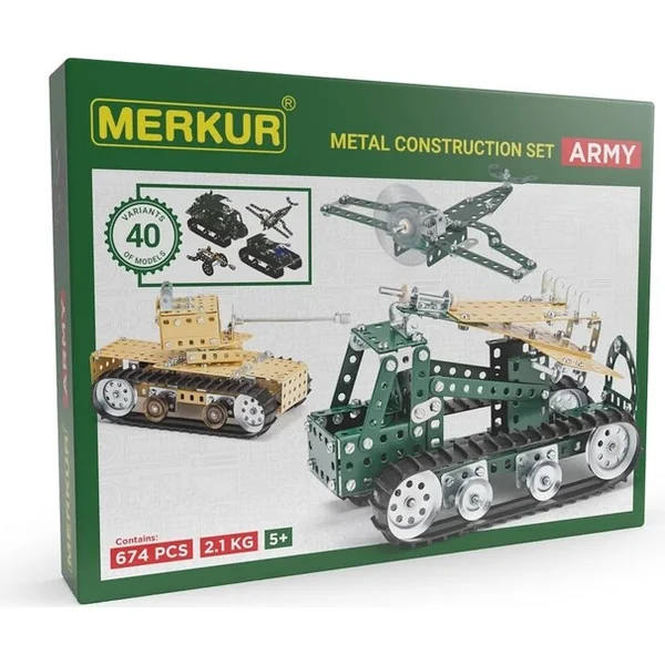 Kit Merkur Army set. Le kit est axé sur la technologie militaire. Il est possible de construire deux armées. L’une en camouflage sable et l’autre en camouflage vert foncé.