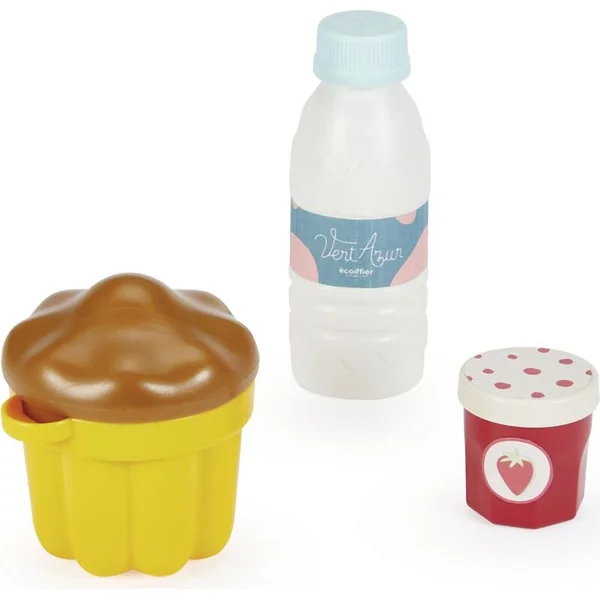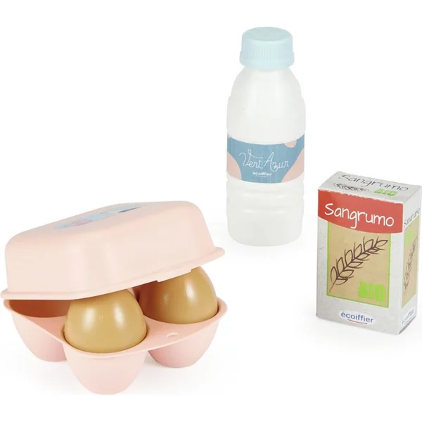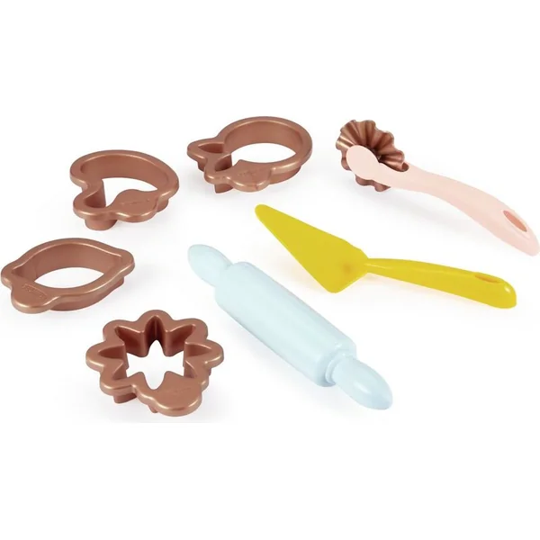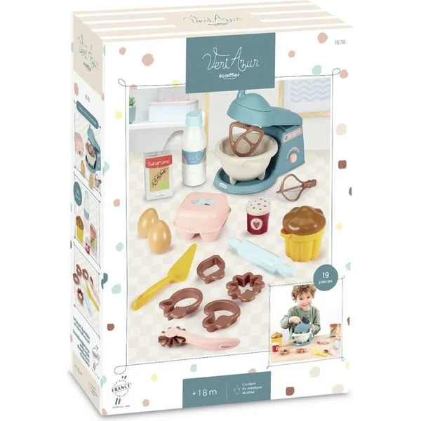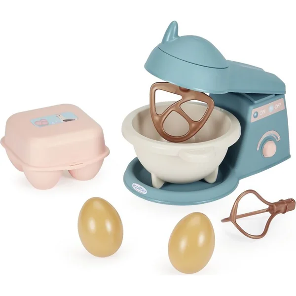 Le set contient tout le nécessaire pour les petits pâtissiers. Un fouet avec 2 embouts interchangeables, un moule et des emporte-pièces pour la cuisson, un rouleau, des découpoirs, des œufs et d’autres maquettes alimentaires.