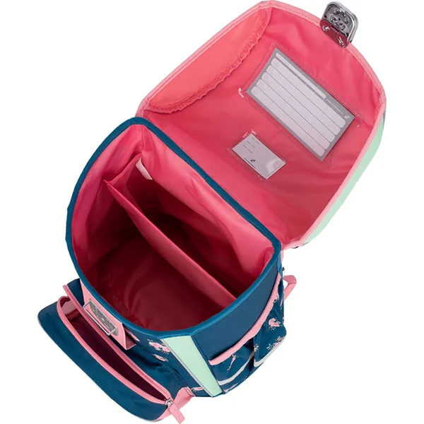 - La poche avant est destinée au goûter, et elle est dotée de plusieurs éléments réfléchissants, rendant le cartable plus visible.