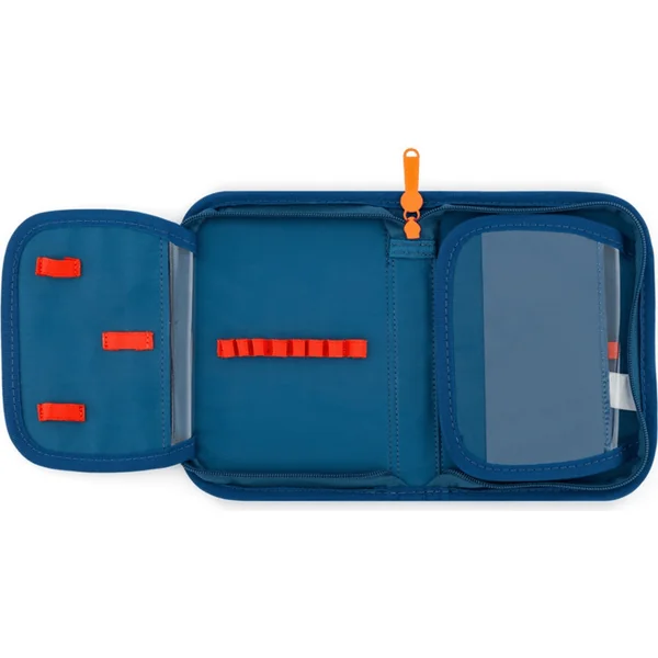 Passants en caoutchouc pour fixer les fournitures d’écriture. Sur le rabat intérieur, il y a un film transparent pour l’emploi du temps.