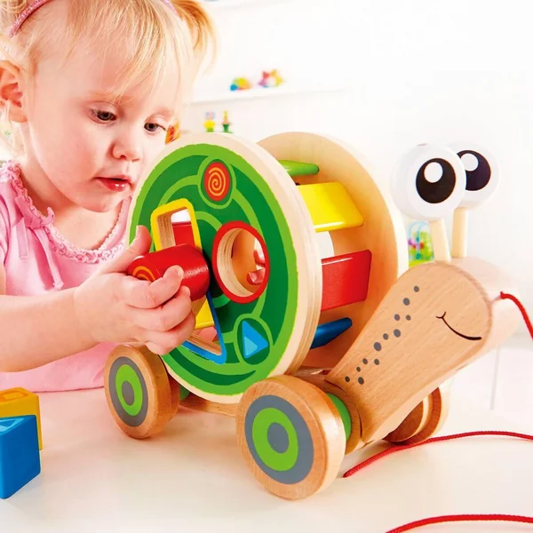 Cet escargot multifonctions porte une coquille remplie de blocs de bois. Allégez l’escargot en enlevant la roue avec les formes colorées, et il pourra rouler tout seul.