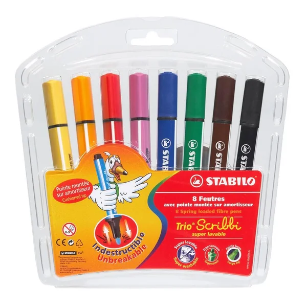 Le feutre STABILO Trio Scribbi est idéal comme premier feutre pour les enfants à partir de 3 ans. Sa pointe moyenne est montée sur ressort, l’enfant apprend à doser la pression exercée lors de son coloriage, pour bien appréhender la prochaine étape qu’est l’écriture. S’il appuie trop fort , la pointe rentre à l’intérieur du feutre pour éviter qu’elle ne se torde ou se casse. Le feutre STABILO Trio Scribbi est idéal pour les toutes petites mains grâce à son corps large et triangulaire. Disponible en 8 coloris intenses, l’encre à base d’eau du feutre STABILO Trio Scribbi ne tâche pas et est super lavable sur la plupart des textiles (lavage à 40°C en machine).