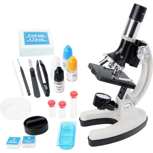 Il fonctionne avec 2 piles aa – 1,5v, piles non incluses. Ce kit d’observation contient : 1 microscope avec 3 types de grossissement 300x, 600x, 1200x, 4 flacons, 1 boite de pétri, des ustensiles, 1 éprouvette, 5 lames exemple, 7 lames vierges.