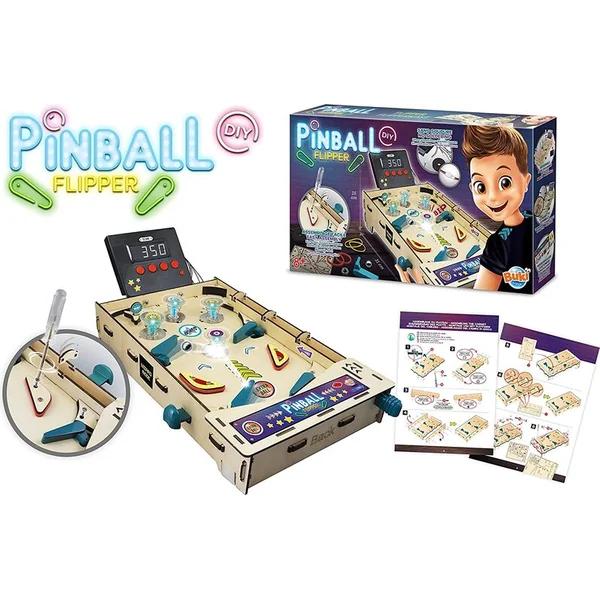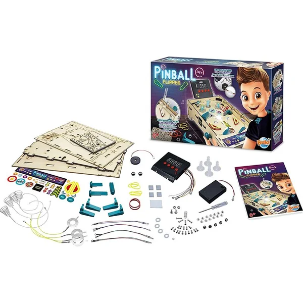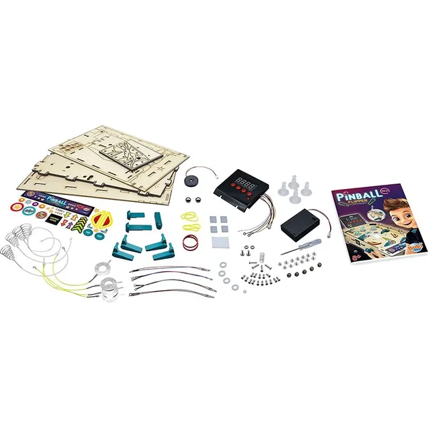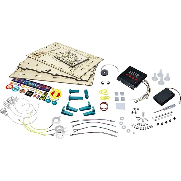Le kit comprend des connecteurs non soudés, auxquels vous pouvez facilement connecter des composants électroniques, des diodes lumineuses et un tableau de scores. Les autocollants fournis vous permettent de personnaliser votre flipper selon vos envies. Une fois assemblé, vous pouvez jouer avec des amis ou battre vos propres records. Le tableau électronique émet des sons à chaque contact avec les composants électroniques et compte les points des joueurs.