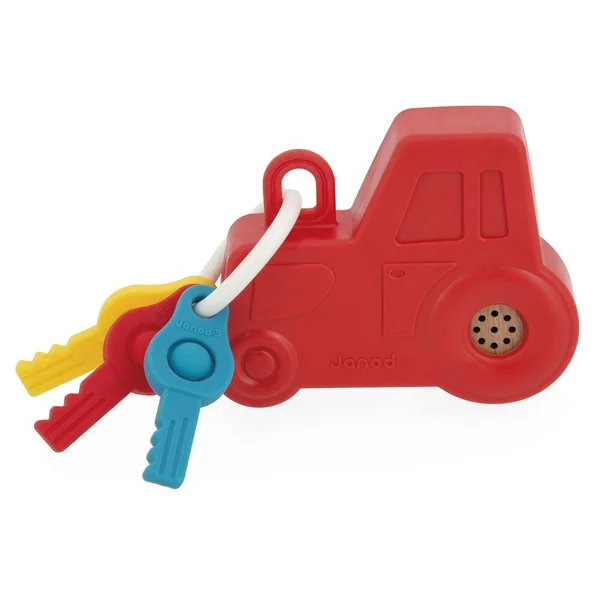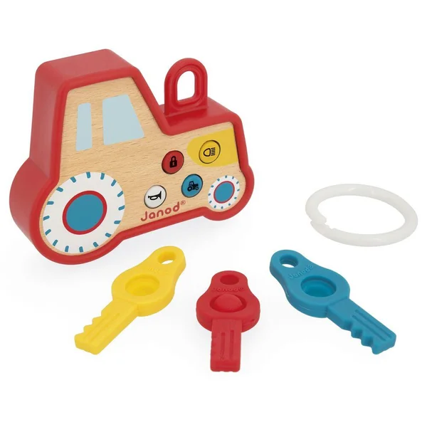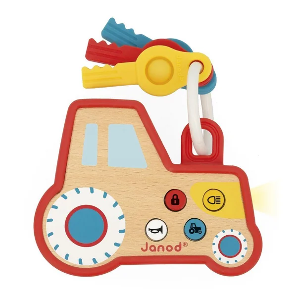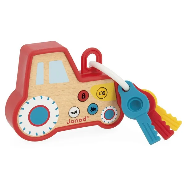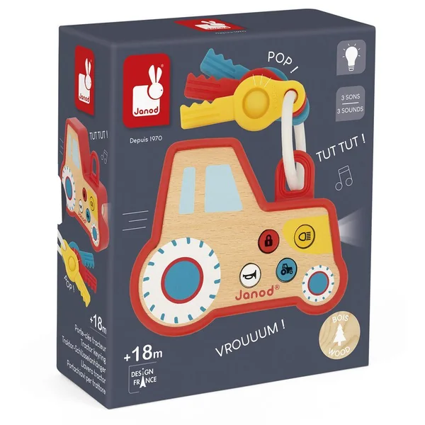 Tous les petits rêvent d’avoir un porte-clés comme les grands ! Celui-ci est fait pour eux ! En bois et en forme de tracteur, il est agréable à prendre en main avec sa coque en silicone. Très attractif, il est doté d’un bouton qui allume les feux du tracteur à l’avant et de 3 boutons avec un effet sonore réaliste : ouverture, klaxon et démarrage du moteur. Il possède également 3 clés en silicone, avec une fonction pop-it, favorisant la motricité fine et le développement sensoriel. Développe la coordination main-oeil. Jouet d’éveil en bois FSCTM, à partir de 18 mois.
