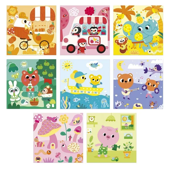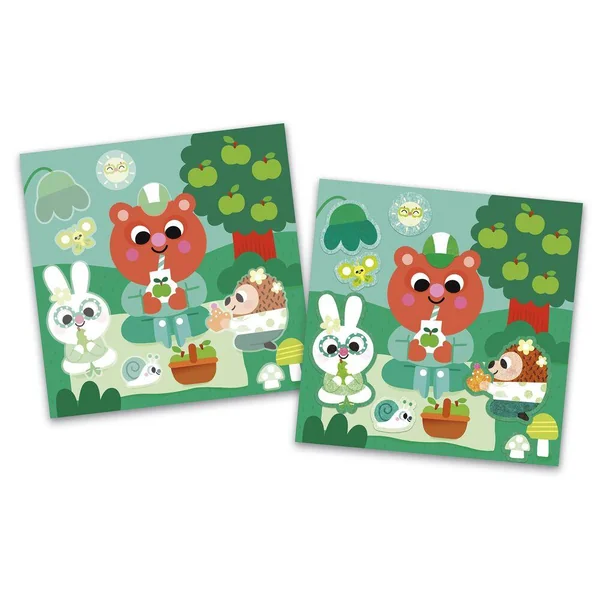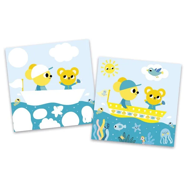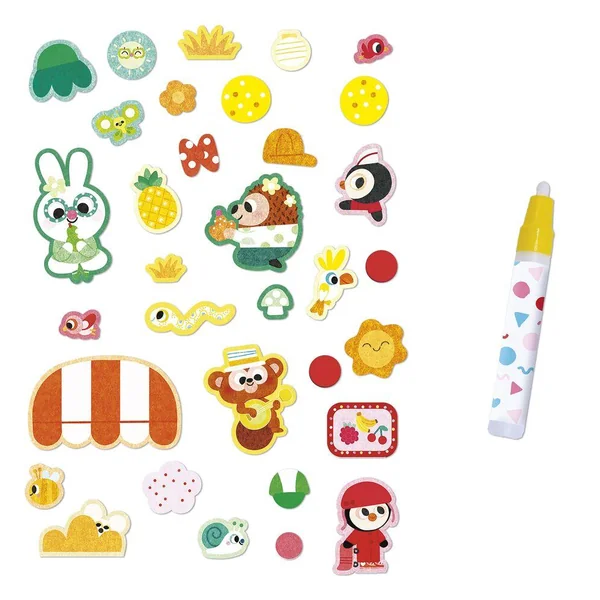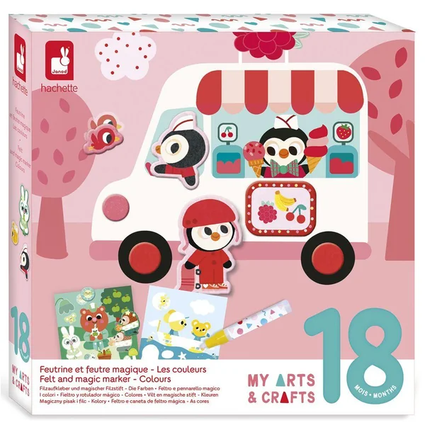 On apprend les couleurs ! Ce kit créatif contient 2 tableaux-recto verso à colorier avec un feutre à réservoir d’eau ainsi que 4 tableau à compléter avec des feutrines autocollantes repositionnables. On commence par trier les feutrines par couleur sur les emplacements imprimés dans le fond de la boîte. Puis on complète ses tableaux avec les feutrines de la même couleur. Il contient 4 tableaux recto/verso (soit 2 tableaux) de 20 x 20 cm à colorier avec un pinceau à réservoir d’eau, un pinceau à réservoir d’eau, 4 tableaux autocollants, 4 planches de feutrine prédécoupée et imprimée, et ?1 livret avec les instructions et les modèles.? Cette activité dure environ 1h et permet de se familiariser avec les couleurs et de développer sa concentration.