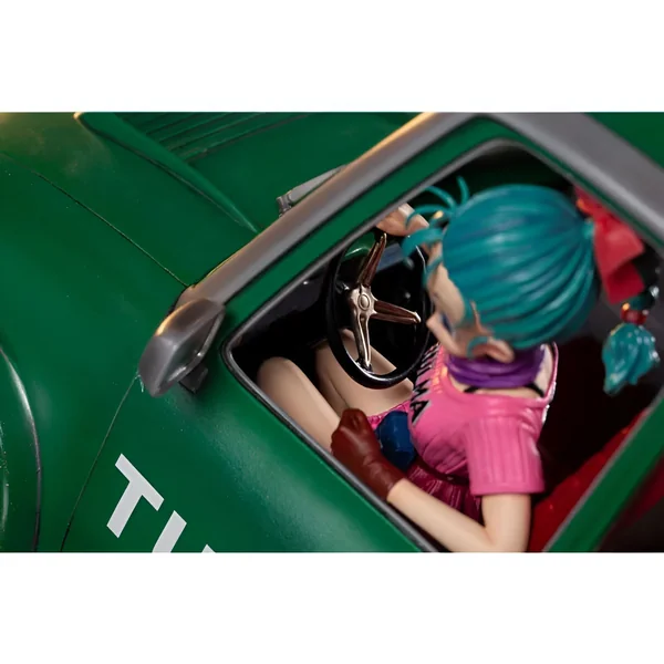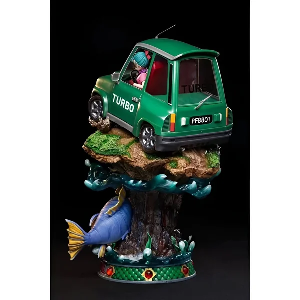 Cette figurine capture un moment charnière de la rencontre entre Bulma et Son Goku. La voiture de Bulma, avec son design reconnaissable et ses inscriptions « Turbo », est figée en plein élan, sur un rocher accidenté qui semble tout juste émerger de l’eau. Chaque détail est travaillé avec soin, des pare-chocs aux rétroviseurs, en passant par la carrosserie, témoignant d’une fidélité à la série animée. L’attention portée aux textures et aux couleurs apporte un réalisme saisissant à cette scène iconique.