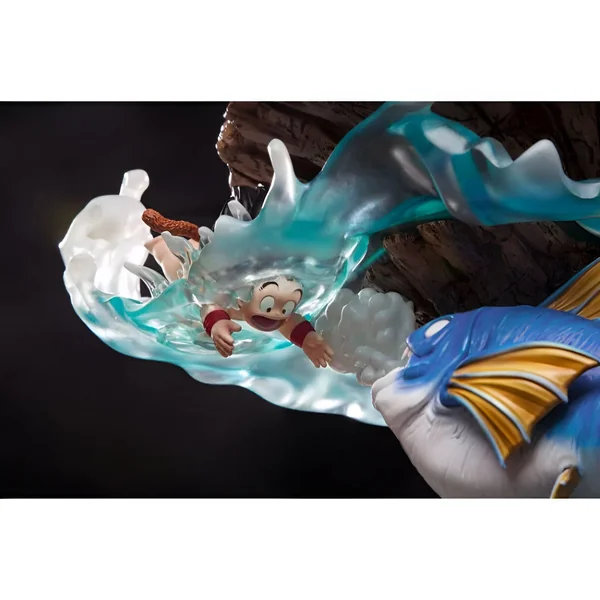 Le dynamisme de la scène est accentué par les effets d’eau sculptés avec une grande précision. Les vagues semblent onduler autour de la base de la figurine, créant un mouvement qui contraste avec la stabilité apparente de la voiture perchée sur son rocher. Son Goku, pris au piège dans les remous, lutte pour échapper à un poisson gigantesque, lui aussi parfaitement retranscrit avec ses écailles et ses nageoires détaillées. Les nuances de bleu et de blanc de l’eau, combinées aux teintes vives du poisson, apportent une dimension colorée à l’ensemble.