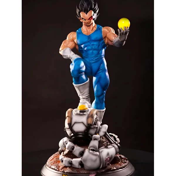 Le pouvoir de Vegeta est palpable, même figé dans le temps. Sa posture, équilibrée et dynamique, suggère la puissance qu’il est capable de déployer à tout moment. On peut ressentir l’énergie qui émane de lui, notamment grâce à la boule de Ki qu’il tient dans sa main. Cette sphère de couleur jaune attire le regard et contraste avec le bleu de sa tenue. Le détail de l’énergie concentrée est visible, renforçant le sentiment de force et de maîtrise. On le voit prêt à libérer sa puissance, un instant figé avant l’explosion de son énergie Saiyan.