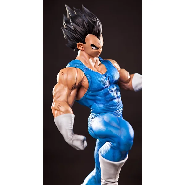 L’attention portée aux détails est remarquable, les traits de son visage sont précis, sa coiffure est travaillée, et chaque muscle de son corps est modelé avec soin, tout en respectant les proportions vues dans l’animé. La sculpture du gilet d’armure bleu, ainsi que des bottes et des gants blancs, est fidèlement restituée, avec ses textures caractéristiques. Le contraste des couleurs vives de sa tenue avec le teint de sa peau et la couleur sombre de son détecteur contribue à souligner la force du personnage. Cette figurine capture l’essence même de Vegeta, le prince fier et puissant.
