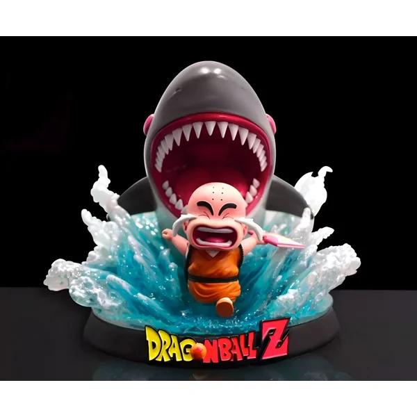 Cette figurine met en scène Krilin dans une situation pour le moins inhabituelle, loin des combats épiques contre des Saiyans ou des démons intergalactiques. La détermination visible sur son visage, malgré la menace imposante du requin, rappelle son courage indéfectible. Même face à un danger imprévu, Krilin ne recule pas, illustrant parfaitement l’esprit combatif qui anime les personnages de Dragon Ball. Cette scène, bien que sortant des sentiers battus des affrontements habituels, capture l’essence même des aventures rocambolesques que vivent nos héros. On y retrouve l’humour et l’action qui font le charme de la saga.