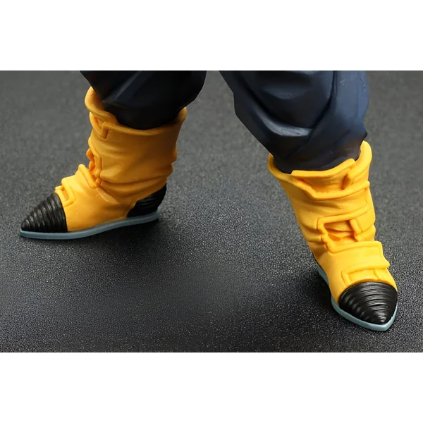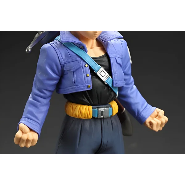 Cette figurine saisit avec précision l’apparence de Trunks lorsqu’il atteint sa forme de Super Saiyan, arborant la chevelure dorée et hérissée qui témoigne de son pouvoir accru. Le soin apporté aux détails de son visage, avec son expression résolue, reflète la détermination qui le caractérise. Sa tenue, composée d’une veste bleue, d’un pantalon sombre et de bottes orange, est reproduite avec une grande fidélité. Le fourreau de son épée est également présent, témoignage de son rôle de guerrier venu du futur pour modifier le cours de l’histoire. Chaque aspect de la figurine, de la musculature jusqu’aux plis de ses vêtements, est conçu pour rappeler les scènes iconiques de Dragon Ball Z. La posture et la morphologie rappellent le moment ou Trunks défia les cyborgs.