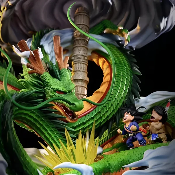 Le rendu des nuages tourbillonnants autour de Shenron accentue son caractère surnaturel. La base herbeuse, sur laquelle se trouvent Goku et Bulma, ajoute une touche de réalisme à la scène. Ces détails, souvent laissés pour compte dans les figurines classiques, sont ici traités avec la plus grande attention, témoignant d’un travail de conception minutieux. L’énergie émanant du dragon est palpable, presque visible, un effet renforcé par le jeu de couleurs et de textures. L’ensemble dégage une atmosphère onirique et enchanteresse, un hommage vibrant au monde de Dragon Ball.