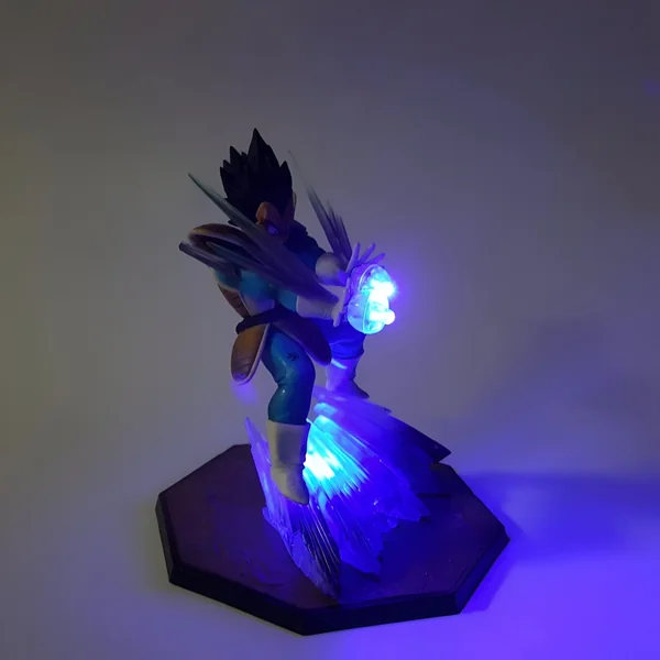 L’élément distinctif de cette figurine réside dans son système d’éclairage LED intégré. Les deux sphères d’énergie du Double Kikoha s’illuminent, recréant l’aura menaçante et la puissance destructrice de cette technique. La lumière vive qui émane des mains de Vegeta contraste avec son expression concentrée, soulignant la maîtrise et le contrôle qu’il exerce sur cette énergie phénoménale. La base de la figurine est également équipée de LEDs, simulant l’impact de l’attaque au sol, ajoutant une dimension supplémentaire au réalisme de la scène. Cette fonctionnalité lumineuse ne se contente pas d’embellir la figurine ; elle capture l’essence même des combats de Dragon Ball Z, où les échanges d’énergie sont aussi visuellement impressionnants que dévastateurs. L’effet est saisissant, transportant l’observateur au cœur d’une bataille acharnée.