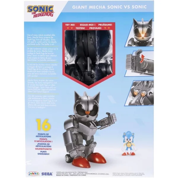 Préparez-vous à un affrontement épique avec le coffret Mecha géant contre Sonic. Mecha regorge de détails impressionnants et de fonctionnalités pour qu’il soit toujours prêt à l’action. Le coffret comprend également une figurine Sonic de 6 cm, pour recréer les meilleures scènes de combat. La figurine Mecha est articulée en 16 points, elle possède des roues sous ses pieds et un jet pack lumineux.