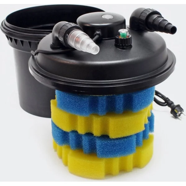 - La filtration efficace se fait à travers des matériaux filtrants spéciaux, tels que des éponges jaunes et bleues avec différentes vitesses de passage de l’eau, qui ont une grande surface permettant la colonisation par des bactéries. Les médias filtrants sont inclus dans l’emballage.
