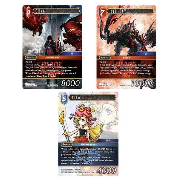 Ce deck base sa stratégie autour de 13 cartes Monstres et d’Avants dont les capacités sont synergiques avec les Monstres, comme Wicth of The Fens [23-104H], Gau [21-102L] et Relm [11-124H]. Il intègre également des staples comme Ifrit (XVI) [24-001L] et Clive [24-005L] pour une domination totale !