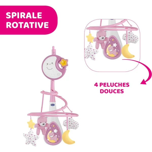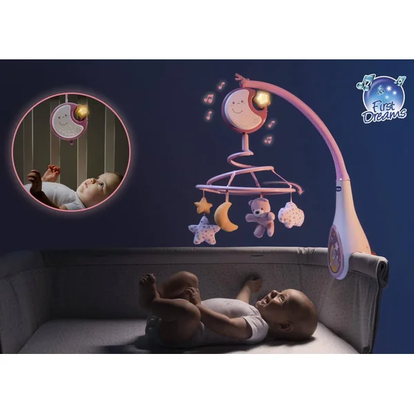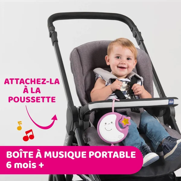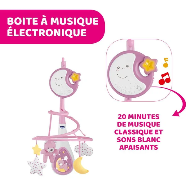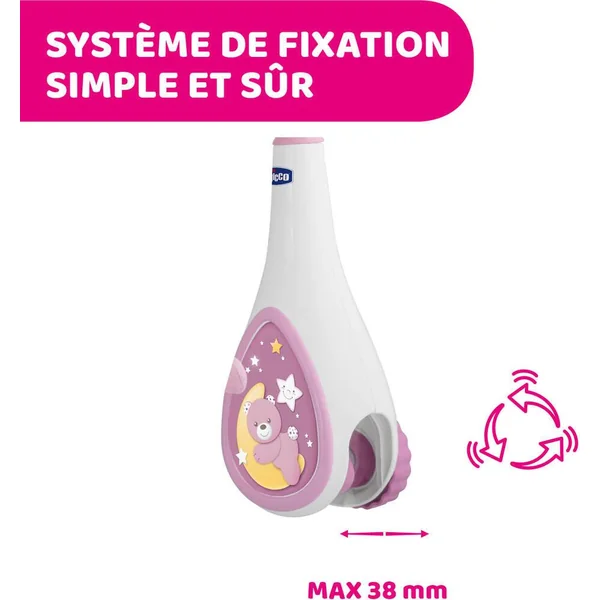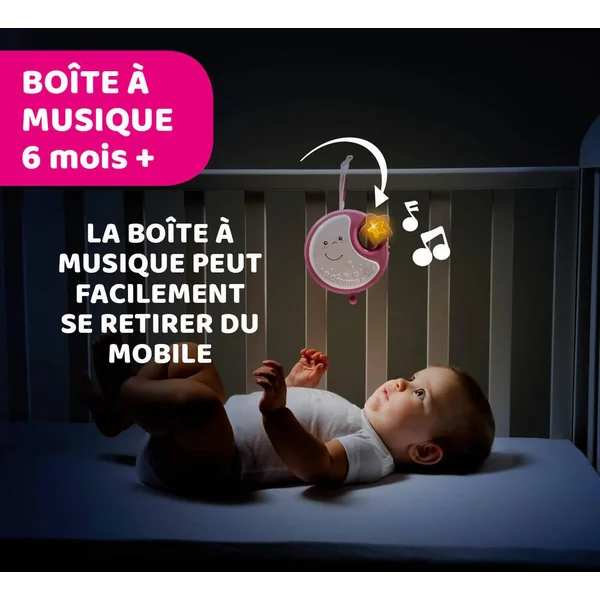 Mobile au système de fixation pratique permettant de le fixer sur les berceaux pleins et à barreaux. 20 minutes de musique classique et bruits blancs et une douce veilleuse berceront bébé et l’emmèneront vers le pays des rêves. Sa partie électronique et lumineuse détachable apaisera Bébé en promenade. Attention ! Afin d’éviter tout risque de blessure suite à un enchevêtrement, ôter le jouet dès que l’enfant tente de se mettre à quatre pattes ou de ramper.
