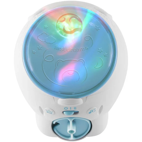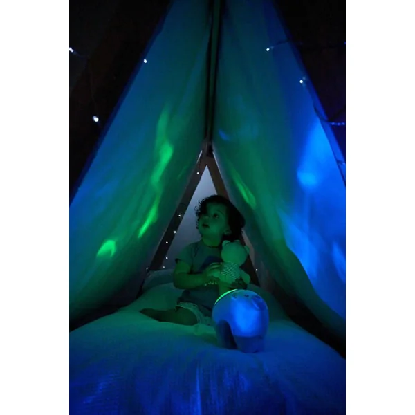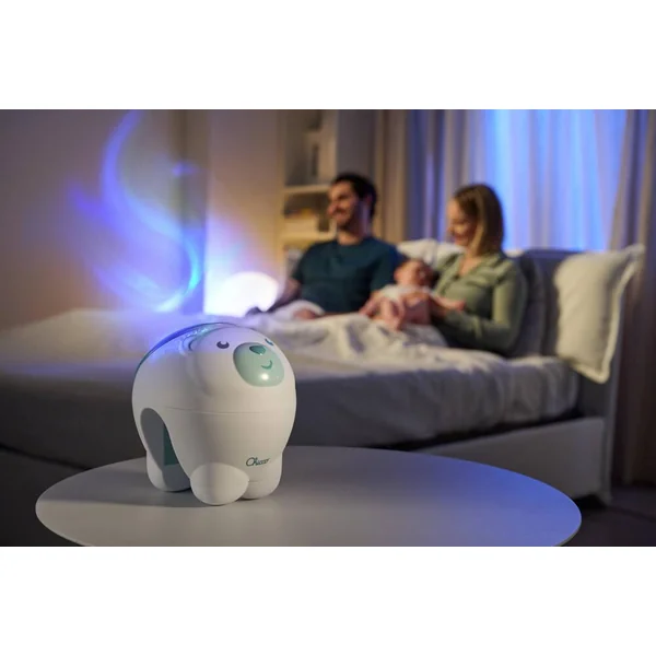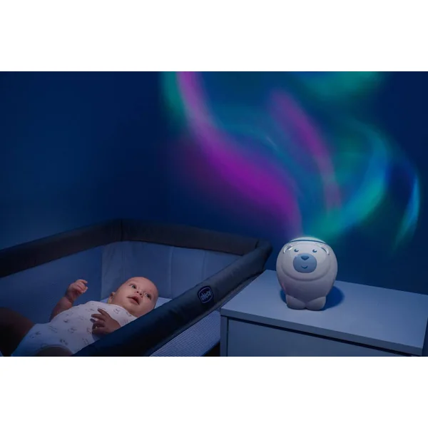 Un projecteur Ourson Polaire et un projecteur de chevet avec une projection magique et dynamique d’aurores boréales pour créer une atmosphère merveilleuse pour le repos de bébé. Il comprend 30 minutes de musique classique (Mozart, Bach, Glinka) et des sons de la nature. Fonctions personnalisables avec deux boutons pour activer et désactiver la projection et pour sélectionner la musique avec 2 niveaux de volume.