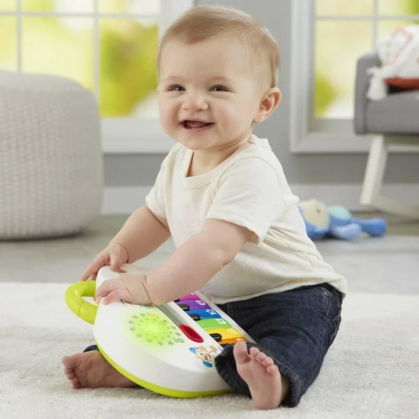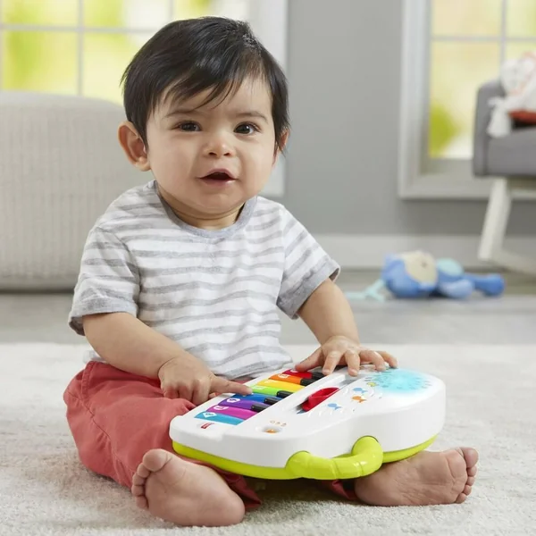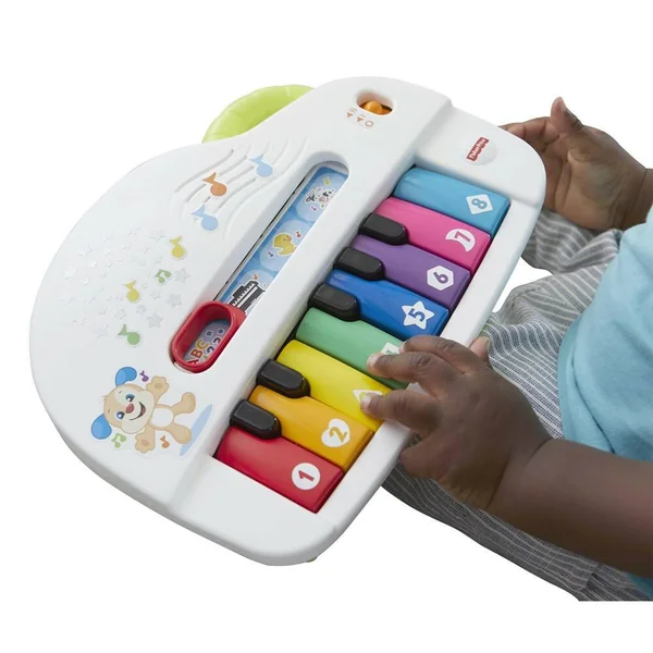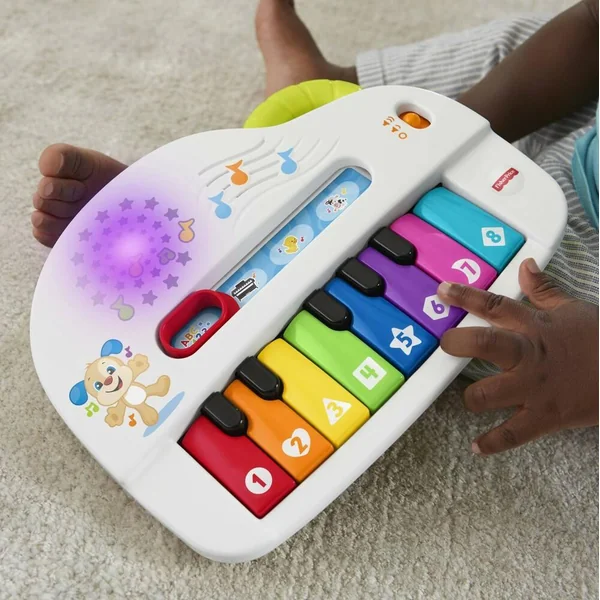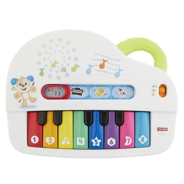 Voici un piano électronique, composé de 8 touches de toutes les couleurs et 4 modes de jeux avec 60 musiques chansons et phrases. 1/Apprentissages des couleurs formes et chiffres en chansons. 2/ Notes de piano. 3/Canard : chaque touche déclenche le son du canard avec les différentes notes. 4/Vache : chaque touche déclenche le son de la vache avec les différentes notes. Les touches du piano déclenchent soit : une note de musique, soit une musique soit des apprentissages ou des sons selon chaque mode, ainsi que de la lumière de la couleur de chaque touche. Le volume est réglable. Une poignée sur le haut du piano permet de le transporter facilement.