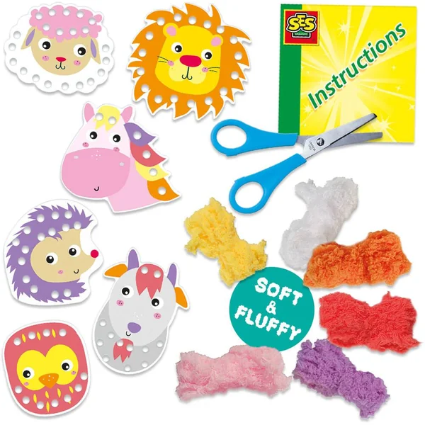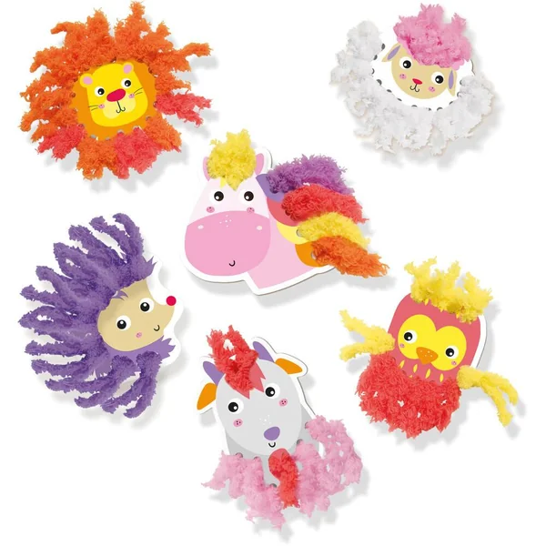 Six animaux ont perdu leur fourrure ou leur crinière ! Les enfants aident les animaux à redevenir heureux à l’aide de ciseaux et de fils super doux et moelleux de six couleurs différentes.