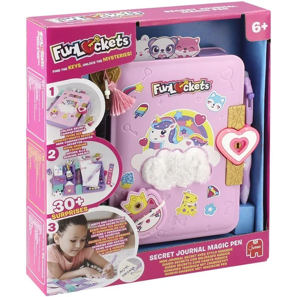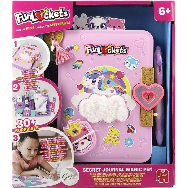 Chaque clé ouvre un compartiment avec des surprises cachées et la clé suivante. Au total plus de 30 surprises sont à découvrir au rythme de 5 clés: des trombones, des pochoirs, des gommes, des rubans décoratifs et de quoi décorer ou personnaliser son journal avec des autocollants ! Sans oublier le stylo magique à encre thermosensible. Tous les compartiments se verrouillent à l’infini pour mettre tous ses secrets bien à l’abri.
