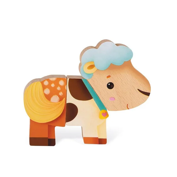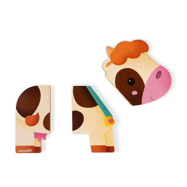 Jouet en bois. Pour enfants de 18 à 36 mois. 3 animaux en 3 parties magnétiques à décomposer, mélanger, reconstituer à l’infini. Un joyeu jeu d’association et d’imagination.