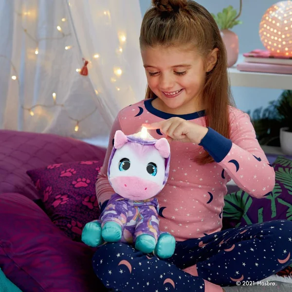 Cette peluche fascinera à coup sûr votre enfant : la nuit, la corne diffuse une jolie lumière bleue apaisante. En appuyant sur son oreille, votre enfant entendra des berceuses et des sons très doux, qui l’aideront à s’endormir. Si on appuie sur sa corne, elle ferme les yeux. Dans la journée en revanche, la licorne interactive FurReal va émettre des bruits quand elle mange et des sons joyeux pour accompagner votre enfant dans ses jeux et ses histoires inventées. Explorez notre sélection de peluches interactives pour voir d’autres modèles.