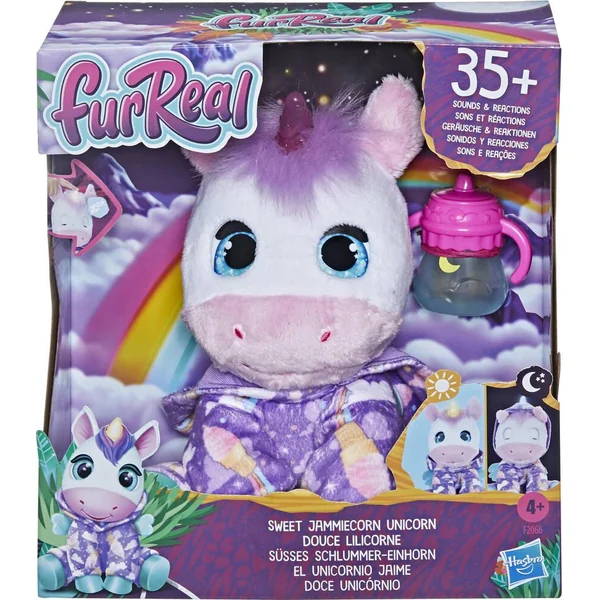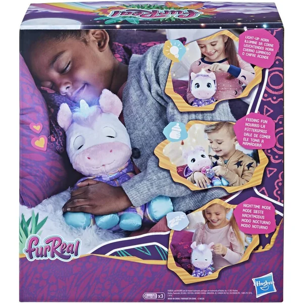 Voici le jouet Douce Lilicorne de furReal qui s’illumine pour tenir compagnie aux enfants de jour comme de nuit. Les enfants (à partir de 4 ans) aimeront prendre soin de cette peluche. Pendant la journée, ils peuvent lui donner son biberon pour l’entendre émettre des sons mignons et joyeux lorsqu’elle mange. Mais encore plus adorable, les enfants peuvent aussi se blottir contre leur peluche interactive à l’heure du dodo. Au moment d’éteindre les lumières, on appuie sur la corne de la peluche pour qu’elle ferme les yeux. Sa corne est jaune vif le jour et bleu apaisant la nuit. Si les enfants veulent entendre des berceuses ou des bruits blancs calmants, ils n’ont qu’à appuyer sur l’oreille de la licorne lorsqu’elle est en mode nuit.