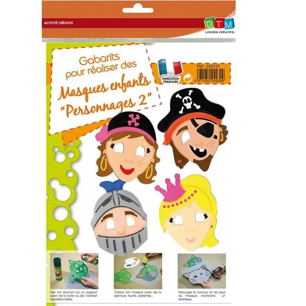 Lot de 4 gabarits masques en plastique semi-rigide, pour découper et décorer des masques en papier ou carton. 4 modèles : pirate garçon, pirate fille, princesse, chevalier. Livré avec mode d’emploi illustré. Pour enfants de 2 à 6 ans. Réutilisables.