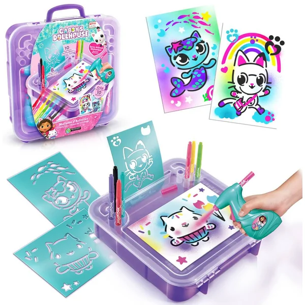Crée d’adorables dessins avec la mallette Gabby et la Maison Magique ! Elle contient tout ce qu’il te faut pour créer des dessins uniques : spray électronique, feutres, pochoirs, feuilles… Ré-utilise la mallette pour ranger et transporter tes dessins !