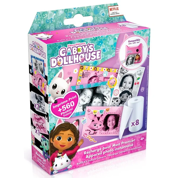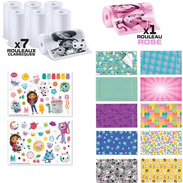 Une recharge de l’appareil photo instantané Gabby pour prendre encore plus de photos et les décorer ! Contient 1 rouleau rose, 7 rouleaux de papier blanc, 2 feuilles de stickers et 10 cadres autocollants. Imprime plus de 500 photos !